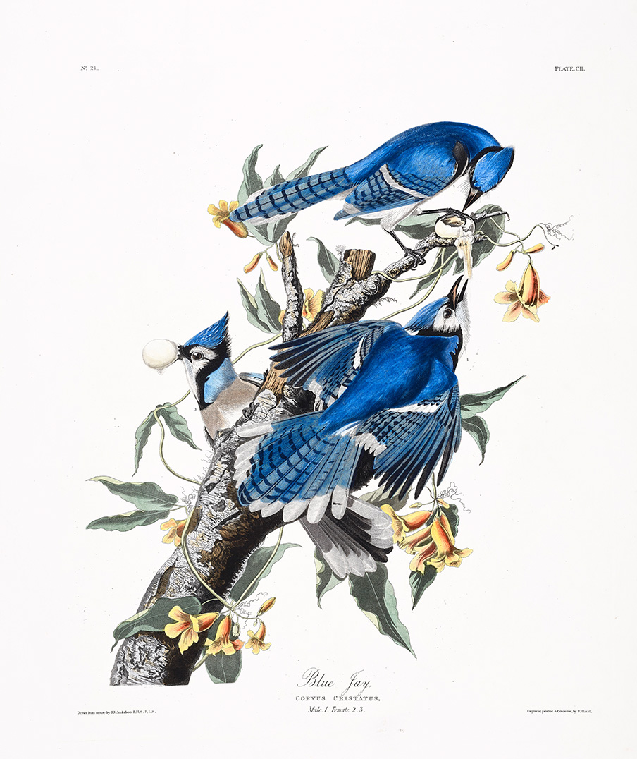 Audubon painted the original portraits in North America. The paintings were then sent to England. There, the engraver and printer Havell produced the images through copperplate etching and hand-applied water colour. The complete run of plates was sent to subscribers in 87 sets of 5 plates each. The collection is now commonly known as the “double elephant folio” edition. This moniker is a direct reference to the impressive size of the paper on which the plates were produced, measuring about 100 cm tall by 70 cm wide.